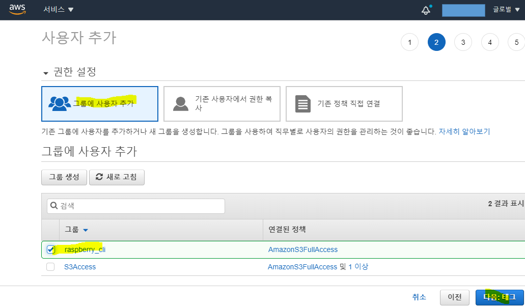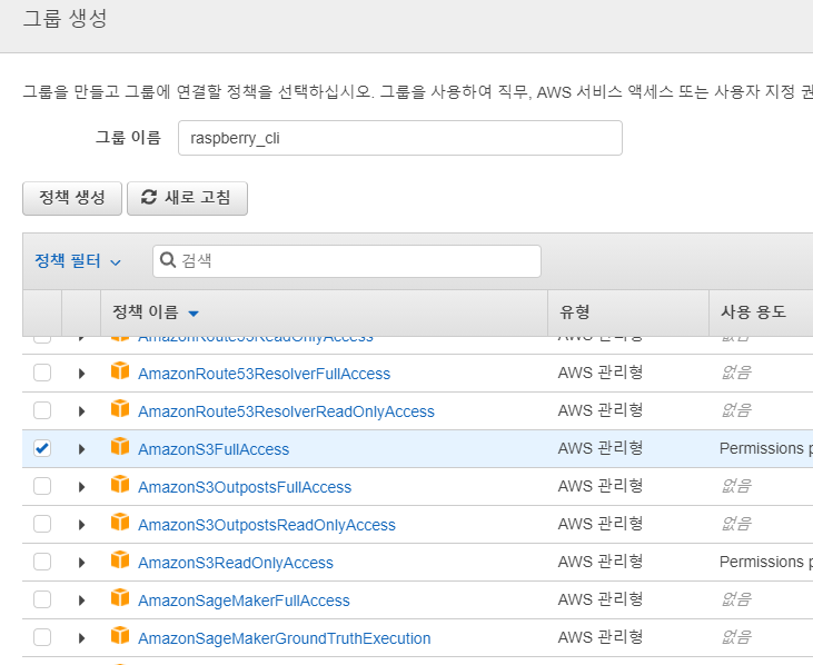 1.4 그룹 생성 -> AmazonS3FullAccess(체크) (라즈베리파이3에서 AWS S3 Full Acccess)