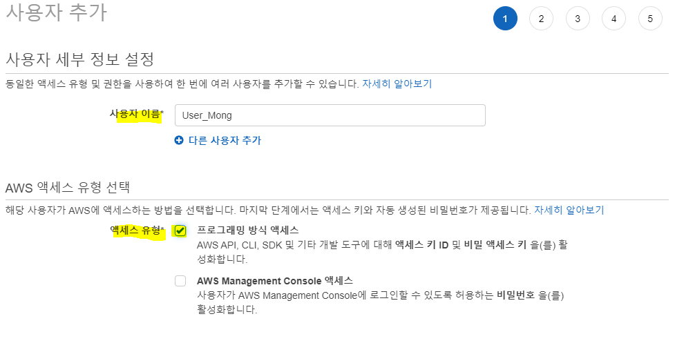 1.3 [사용자 이름] 입력 -> [액세스 유형] 프로그래밍 방식 액세스 (체크)